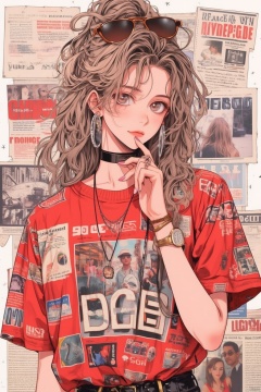 1girl, solo, long hair, looking at viewer, brown hair, shirt, brown eyes, jewelry, upper body, ponytail, short sleeves, earrings, choker, necklace, nail polish, bracelet, english text, black choker, sunglasses, ring, red shirt, watch, print shirt