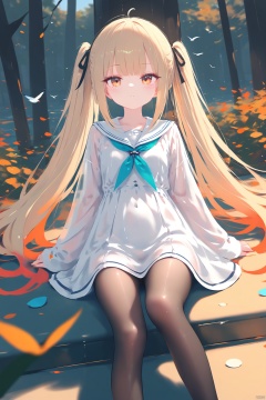 1girl, solo, long hair, bangs, blonde hair, long sleeves, dress, twintails, sitting, very long hair, school uniform, outdoors, barefoot, sailor collar, white dress, tree, neckerchief, bare legs, bird, looking away, looking up, plant, blurry foreground, see-through,  ((loli))),(petite:1.2),(cute:1.2),((masterpiece)),(((best quality))),((ultra-detailed)),((illustration)),Depth of field,(colorful), [artist:wlop],[[artist:sheya]],artist:hiten_(hitenkei),Black pantyhose,