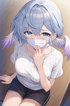score_9,score_8_up,score_7_up,score_6_up,score_5_up,score_4_up,source_anime,source_cartoon,<lora:robinTUPONYXL-000008:1>,robin \(honkai: star rail\),1girl,solo,head wings,shirt,shorts,mouth mask,black shorts,looking at viewer,mask,white shirt,breasts,sitting,blush,green eyes,grey hair,mask pull,hand on own chest,closed mouth,hair intakes,short sleeves,short shorts,short hair,medium breasts,head wings,from above,