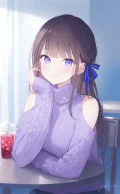 masterpiece,best quality,high quality,(colorful),loli,1girl,solo,flower,shoulder cutout,purple eyes,looking at viewer,sweater,signature,clothing cutout,smile,hair ribbon,cup,long hair,drinking straw,long sleeves,sitting,brown hair,ribbon,closed mouth,chair,upper body,piercing,turtleneck,drink,hand up,ear piercing,table,blush,indoors,earrings,turtleneck sweater,arm rest,sleeves past wrists,blue ribbon,bare shoulders,purple sweater,disposable cup,ice,purple flower,