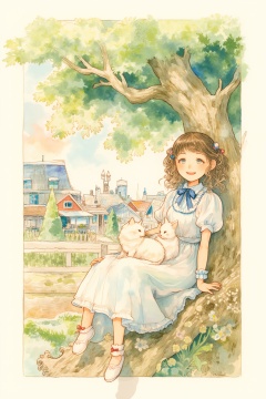 watercolor \(medium\), 1girl, tree, cat, dress, painting \(medium\), sitting, brown hair, solo, smile, outdoors, on lap, ribbon, white dress, open mouth, building, short sleeves, house, animal on lap, white cat, bangs, puffy sleeves, bow, blue ribbon, blush, shoes, white footwear, hair ribbon, puffy short sleeves, hair bow, flower, twintails, in tree, brown eyes, plant, looking at viewer, arm support, double bun, neck ribbon, hair bun, window, branch, animal, blue bow, day, :d, sandals, ahoge, pale color, railing, grey eyes, frills, scenery, blue dress, full body, short hair, nail polish, rabbit, sitting in tree, bird, frilled dress, town, leaf, red ribbon, socks, petting, medium hair, collared dress, shirt, sunlight, sky, long hair, blue flower, acrylic paint \(medium\), dutch angle