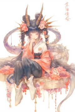 watercolor \(medium\), 1girl, solo, flower, blue eyes, black hair, long hair, sitting, smile, looking at viewer, long sleeves, pants, very long hair, braid, hair bun, red flower, horns, double bun, bug, painting (medium), full body, white background, blush, bangs, closed mouth, eyeshadow, coral, hair ornament, twintails, sash, makeup, shoes, tail, head rest, dragon girl, wide sleeves, signature, knees up, dragon tail, dragon, hand up, dragon horns, butterfly, shirt, antennae, black pants, white footwear, twin braids, head fins, spider lily, hand on own face, pink flower, white flower, white shirt, japanese clothes, wings, hand on own chin, boots