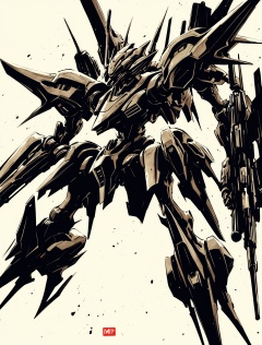 best quality,masterpiece,absurdres,newest,<lora:GENESIS_MK0.2:1>,(dramatic angle,dynamic angle,dynamic pose:1.1),(dame style:1.5),traditional media,painting (medium),retro artstyle,shadowphoto (medium),(bp (mecha),brain powered:1.3)(chibimecha:1.3), (armored core:1.1), no humans, solo, mecha, white background, ,full body, holding weapon, black body,glod eyes,holding gun,(high heels), flying