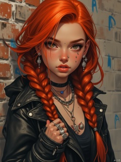Create a portrait of a teenage girl with fiery red hair styled in intricate braids, adorned with small, silver beads. She has freckles sprinkled across her nose and cheeks, and her eyes are a warm, hazel brown. She wears a leather jacket over a band t-shirt, and multiple silver rings adorn her fingers. The background is a gritty urban scene, featuring brick walls covered in graffiti. The style should be edgy and modern, with a touch of rebelliousness. Capture a sense of confidence and defiance in her gaze.
