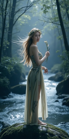Posture: She stood elegantly on a big rock by the stream, gently stroking the branches around her with one hand, holding a blooming lily in the other hand, tilting her head slightly, with a sweet smile on her face, as if Listening to the sounds of the forest.