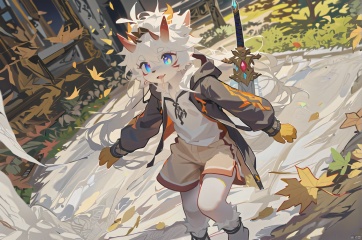 (masterpiece),(best quality),illustration,ultra detailed,hdr,Depth of field,(colorful),artist:wanke,artist:tianliang duohe fangdongye,bright outline,1girl, solo,dragon girl,slit pupils,blue pupils,glowing eyes,horns,long hair, floating hair, white hair, dragon tail, shiny butterfly, glowing butterfly, soft lawn, warm colors, Tyndall effect, Tyndall light, white long shirt, black sleeveless jacket, orange transparent sleeves, transparent Ceiling, fallen leaves, maple leaves, autumn, between two rows of trees there is a road filled with fallen leaves, in the middle of the road there is a beam of light shining on a sword stuck in the ground, sacred, ancient, side shot, wide angle shot, shorts, stepping Foot socks, hanging,transparent,transparent wings,Leather gloves, sharp teeth, mouth drool, clear glass strips, ancient wooden swords engraved with golden runes, foot socks, light gray foot socks, the bottom of the foot socks fades to black,source-furry,bichu