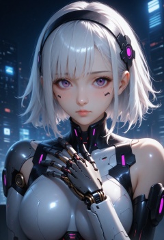 score_9,score_8_up,score_7_up,1girl,solo,looking at viewer,medium hair,bangs,hairband,purple eyes,hair ornament,hair between eyes,white hair,fluffy hair,large_breasts,blush shy,shiny_skin,very detailed clothes,very realistic textures,very detailed textures,longeyelashes,brown eye shadow,night,dim light,cyberpunk,mechanical arm,sci-fi style clothes,hair_tucking,metal material,realistic metallic texture,hands,raise your hand,