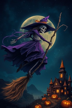 A midnight sky ablaze with stars, the only light source for this haunting scene. A luminous broom, its glow illuminating the dark atmosphere, supports an old skeleton witch dressed in a stunning purple costume. Her wicked smile and piercing gaze seem to pierce through the darkness as she soars diagonally towards the upper right, her silhouette stark against the starry canvas. In the background, a glowing moon hangs low, surrounded by a majestic castle crafted from pumpkins, its intricate details a testament to the whimsy of this western fantasy world.