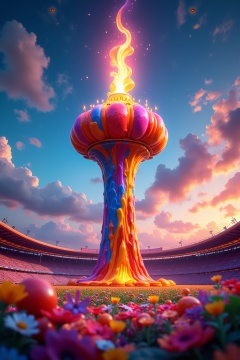 look up, There is a luxury building torch high above the playground, Jelly style, A pumpkin, Luxury texture, Stadium landscape, A flame rising from the top of the torch building, No expression emotional, no features, Colorful bright colors, vivid and cute atmosphere, 3Dmax, soft shadows, unbelievable vision, high quality photos