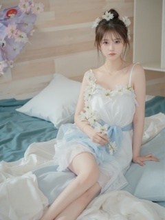 a Asian woman is seated on a bed. She is dressed in a white strapless dress with a blue sash tied around her waist,adorned with white flowers. Her hair is styled in a bun with a few white flowers on it,adding a pop of color to the scene. Her eyes are a piercing blue,and her lips are a pinkish-pink. Her feet are bare,and she is barefoot. The bed she is lying on is a teal sheet,with a white pillow on it. The backdrop is a light wood wall with a shelf on the right side of the frame. A purple umbrella is adorned with pink flowers and has a red button in the center of it.,