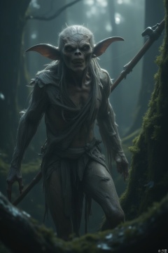 A close-up of a ragged goblin, dressed in tattered cloth strips, wielding a large wooden club. The scene is set in a dark, dank forest, with moss-covered trees and a misty atmosphere. The goblin's expression is fierce and determined, with sharp, menacing eyes. The lighting is dim, with shafts of light piercing through the canopy, casting eerie shadows. The composition is dynamic, with the goblin's pose aggressive and ready for combat.