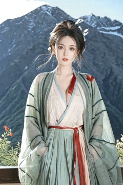 solo,highly detailed,(best quality),((masterpiece)),1girl,black hair,short hair,hanfu,see-through,looking_at_viewer,from below,upper body,mountain,huge_breasts,arms behind back,cleavage,