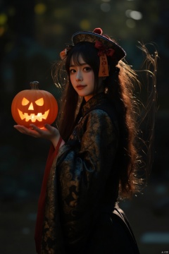 A stunning 8K visual masterpiece! A single female figure stands out against a darkened backdrop, her long brown hair cascading down her back like a golden waterfall. Her gaze is fixed directly at the viewer, an air of quiet determination etched on her face. She wears a flowing Chinese-inspired outfit with wide sleeves and a hat adorned with intricate designs. In one hand, she holds an ofuda, its delicate threads seemingly suspended in mid-air. The other hand cradles a jack-o'-lantern, its carved design glowing softly in the dim light. Her facial expression is marked by a subtle, enigmatic smile. The atmosphere is eerie yet captivating, as if time itself has frozen around her.