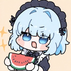 <lora:oldstore:1>,masterpiece,best quality,,,chibi, ,1girl,solo,,,,maid,, ,light blue hair,,short hair,,, maid headdress, black headwear, , ,,light blue eyes,,,, simple background, meme,upper_body,solo,holding_watermelon_slice,watermelon_slice,holding_fruit, eat_watermelon_slice, open mouth, focus on face
