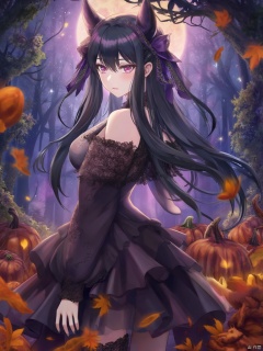 torino,Yor,Create an enchanting anime-style illustration of a beautiful woman with flowing black hair, dressed in an elaborate Halloween costume. She stands in a moonlit forest, surrounded by glowing pumpkins and swirling autumn leaves. The composition should focus on her striking features, with her hair cascading elegantly over her shoulders. Utilize soft, ethereal lighting that casts gentle shadows, enhancing the mystical atmosphere. The color palette should include deep purples, vibrant oranges, and hints of silver to evoke a magical, Halloween vibe. Incorporate intricate details in her costume, such as lace and shimmering fabrics, showcasing textures that contrast with the smoothness of her skin. Capture a sense of motion as leaves dance around her, creating a whimsical yet slightly eerie mood. Aim for high-resolution quality, suitable for a stunning print, with sharp details and vibrant colors,Beautiful face