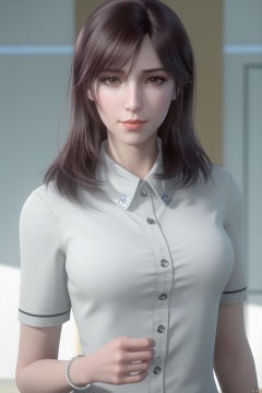 (Clear lines, high definition, Best quality, masterpiece, 4K),1girl, solo, long hair, breasts, brown hair, shirt, brown eyes, jewelry, medium breasts, closed mouth, white shirt, upper body, short sleeves, collared shirt, bracelet, lips, buttons, realistic, realistic,XuXin