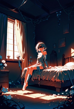 indoors, overgrowned, bedroom, flowers, white flowers, vines, 1girl, wide shot, blindfold, small breasts, bandage arms, bandage legs, torn dress, sitting on bed, scars on face, scars on legs, volumetric lighting, dark,