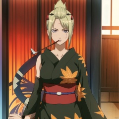 high heel boots,boots, print kimono, parted bangs, scar on forehead, wide sleeves, sleeveless kimono, scar on face, folded ponytail, kiseru, scar on cheek, red ribbon, hair ribbon, sleeveless, ponytail, detached sleeves, bare shoulders, thighhighs, fishnet legwear, sash, maple leaf, fishnets, long sleeves, purple eyes, jewelry, maple leaf pattern on kimono, hairclip, hair ornament, collarbone,scar,Tsukuyo,ninja,kunai,kimono,japanese_clothes,hair_stick,hair_ornament,arm_wrap,autumn_leaves,blonde_hair,black_kimono,1girl, blonde hair, japanese clothes, kimono, leaf, ninja