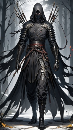This is a vigorous and stealthy night assassin. His figure is slender and flexible, as if blending into the darkness. The assassin's face is covered by a black mask, revealing only a pair of sharp eyes like those of a hawk, showing coldness and determination in his gaze. His hair is short and neat, as smooth as black satin, slightly combed backward, making him look more capable. The assassin is dressed in a set of black tight-fitting night clothes. The fabric is light and has good flexibility, allowing him to move freely without any hindrance. The night clothes are decorated with exquisite silver patterns that are faintly visible, adding a touch of mystery. Around his waist is a black leather belt, on which various hidden weapons and tools are hung, such as sharp daggers and small poison needle tubes. On his back, he carries a black longbow, with the bowstring taut, as if ready to shoot a fatal arrow at any moment. The assassin wears black leather wrist guards on his wrists, with small metal pieces embedded on them, which not only provide certain protection but can also be used as weapons for attack at critical moments. His feet are clad in black soft-soled boots. The **** of the boots is thin and soft, making him walk silently.