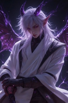 An illustration of the Blackheart from Final Fantasy, with purple lightning and a dark black background. He is holding his sword in one hand and wearing white with demon wings on top of it. The full-body shot is shown, and he has long hair. The artwork should be done in the style of manga. (White hair) Masterpiece: 1.2), best quality, high resolution, uniform 8k wallpaper, (Illustration: 1), perfect lighting, very detailed CG, fine Detail, Very detailed, soft lighting and Shadows, soft and striking lighting, Film Texture: 1.2, (Skin pores: 1.2), (Detailed Skin texture: 1), (Solo: 1.5)), detailed face, (Perspective: 1.1), hazy, low-key: 1.1, Depth of field, (8k, RAW photo, best quality, Masterpiece: 1.2), (Realistic, realistic: 1.4), (Very detailed CG unified 8k wallpaper), (Detailed face: 1.4), (Beautiful detailed eyes: 1.2)