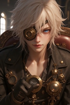 A stunning anime male character with blonde hair and blue eyes, wearing steampunk attire that includes an eye patch over his right eye. He is holding a gold pocket watch in one hand while sitting in a chair. The background features a gothic-style interior, adding to the overall aesthetic of exquisite detail. The focus is on the character's face(White hair) Masterpiece: 1.2), best quality, high resolution, uniform 8k wallpaper, (Illustration: 1), perfect lighting, very detailed CG, fine Detail, Very detailed, soft lighting and Shadows, soft and striking lighting, Film Texture: 1.2, (Skin pores: 1.2), (Detailed Skin texture: 1), (Solo: 1.5)), detailed face, (Perspective: 1.1), hazy, low-key: 1.1, Depth of field, (8k, RAW photo, best quality, Masterpiece: 1.2), (Realistic, realistic: 1.4), (Very detailed CG unified 8k wallpaper), (Detailed face: 1.4), (Beautiful detailed eyes: 1.2)