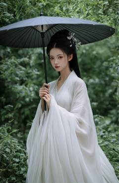 score_9,score_8_up,score_7_up,score_6_up,score_5_up,Hanfu, the traditional Chinese attire, is depicted in this image. The individual is clad in a flowing white garment with delicate embroidery, symbolizing purity and grace. A slender, black umbrella is held gracefully, adding an element of elegance and protection. The setting is a lush garden, with greenery enveloping the figure, suggesting a harmonious blend of nature and human adornment.