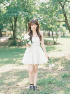 Fujifilm\(hubggirl)\, Captured at eye-level on a sunny day, a young Asian woman, dressed in a white dress and black shoes, is holding a bouquet of white roses in her right hand. She is standing on a patch of grass, with her left leg bent at the knee. The woman's hair is long and cascades in a ponytail, and she is smiling. The background is blurred, suggesting a forest of trees. The sun is shining, creating a soft glow on the scene.