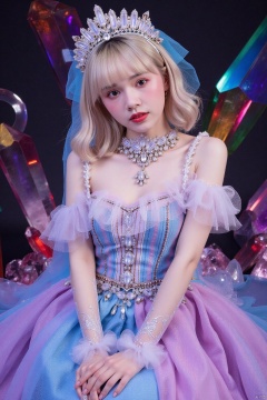 (Masterpiece), (Best quality), Extremely detailed, illustration, ((1girl)), (crystal dress),(colorful crystal),(colorful gradient hair:1.2), crystal headdress, crystal necklace, (body crystal), crystal shops, sitting posture,(colorful crystals),(transparent crystal),Crystal decoration, A crystal pendant,Crystal necklace,(colorfulhair:1.2),(Colorful dresses),High chiaroscuro, (huge crystal background), (colorful themes)