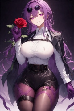1girl, solo, long hair, breasts, looking at viewer, blush, smile, bangs, large breasts, shirt, gloves, long sleeves, holding, closed mouth, purple eyes, jacket, white shirt, purple hair, flower, pantyhose, black jacket, black pantyhose, rose, sunglasses, red flower, eyewear on head, red rose, holding flower, purple gloves