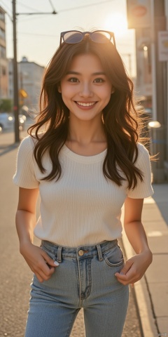 Vibrant morning light bathes the streets of Long Island, New York, as a stunning Asian beauty strikes a confident pose, sunglasses perched on her radiant face. Her strapless T-SHIRT showcases medium breasts ,while tight hot pants accentuate toned legs, as she beams with warm, sunny smile, inviting the viewer in with cinematic camera movement and extreme skin texture detail.