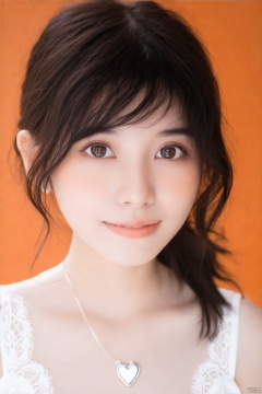 A close-up shot of a young Asian woman with dark brown eyes and dark brown hair. She is wearing a white sleeveless blouse with a white lace trim. She has a silver heart necklace around her neck, simple orange background