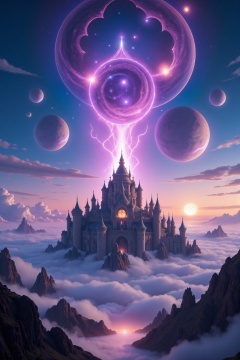 ((master piece)), best quality, (8k, best quality, masterpiece:1.2), ultra-detailed, illustration, big fantasy city, Science fiction, ethereal city, Floating city, many planets in the skies, clouds around, celestial architecture, purple energy scarring around, Giant castle in the center, astral skies
