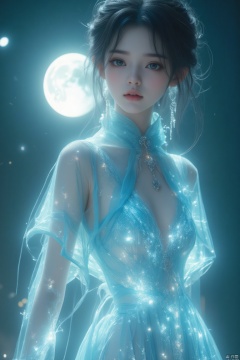 High-detail game CG, studio quality, Chinese-style setting. A young girl in a pale cyan gauze mini-dress, illuminated by a radiant white moonlight. The dress appears to be composed of shimmering moonlight, with intricate patterns of sparkling stars. She stands in a serene landscape, the moonlight casting a soft glow on her form. The composition highlights her ethereal beauty, with the moonlight enhancing the delicate texture of her dress. The scene is rendered with CG effects, capturing the magical interplay of light and fabric.