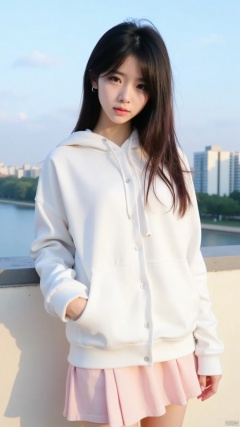 a young Asian woman stands . She is wearing a white long-sleeved button-down hoodie, a light pink skirt. Her hair is long and cascades down to her right, adding a touch of movement to her face. The backdrop, a backdrop of a cityscape can be seen, with a body of water and buildings in the distance. The sky is a pale blue, and the shadow of the woman is cast on the wall behind her.