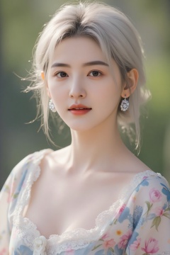 1girl,white short hair,earrings with blue diamonds,hair flowers,upper body,collarbone,Floral clothing,neckband lace,artist tyjf,