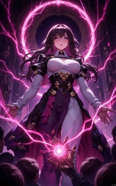 KAFKA\(hubggirl)\, illustration, masterpiece, best quality, extremely detailed, wallpaper, 8k, mysterious, vivid color, shiny, best quality, intricate, good anatomy, beautiful lighting, 1girl, KAFKA\(hubggirl)\, open hand, Lightning, magic circle, light particles, light rays, Magic Circle, cowboy shot, wide shot, volumetric lighting, detailed eyes,