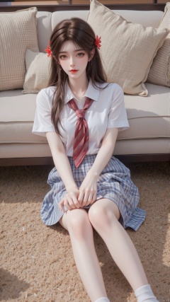 1 girl, solo, long hair, looking at the audience, dress, brown hair, shirt, hair accessories, bow, brown eyes, sitting posture, school uniform, full body, white shirt, flower, short sleeved, pleated skirt, shoes, socks, indoor, hair flower, tie, black shoes, blue dress, pillow, checkered cloth, sofa, checkered cloth dress, brown shoes, white socks, loafers, red lips, lobby. Tall. Long and slender legs. Perfect body proportions.