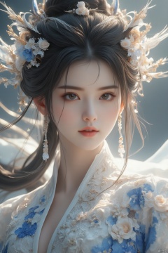 A highly detailed game CG with studio quality, featuring a fisheye lens and a bird's-eye view. The scene showcases a breathtakingly beautiful woman adorned in exquisite Qinghua porcelain-inspired attire, with intricate blue and white patterns. She wears delicate floral hairpins, adding a touch of elegance and femininity. Her features are finely detailed and captivating, exuding an ethereal presence. The composition emphasizes her graceful yet commanding stance, with the distorted perspective of the fisheye lens adding a dramatic flair. The backlight setting enhances her radiant allure, while the intricate textures and dynamic lighting create a visually stunning environment. The shot captures her entire figure, highlighting her elegance and poise from a unique, elevated angle.