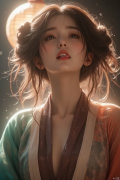 A highly detailed game CG with studio quality, shot using a fisheye lens. The subject is a woman wearing a silk, multicolored gradient Hanfu, looking up with a seductive gaze, her head tilted back. She has big breasts and is framed from a top-down perspective. The scene is illuminated by backlighting, emphasizing her sweat-soaked face and glistening skin. She has a playful expression, sticking out her tongue mischievously. The setting is distinctly Chinese, with CG-level details capturing every nuance of the scene.