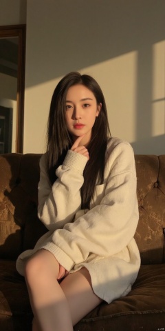 yilin, beauty, black hair, solo, dynamic and exaggerated facial expressions, sitting lazily on an old couch, enjoying afternoon sun, arms wrapped around shoulders, exaggerated movements, old house interior, shadow of window reflected on wall in background, surreal warm cinematic full body shot photography, Kodak Professional Portra 160, soft sunlight, vintage atmosphere, enhanced skin texture and texture details, best quality,masterpiece