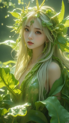 A captivating portrait of a bok choy spirit, a bewitching woman with ethereal features and flowing white-green hair. She is adorned with bok choy leaves and stems, creating a mystical and alluring look. The scene is set in a serene garden with lush greenery and soft sunlight filtering through the leaves. The composition is balanced, with the bok choy spirit in the center, surrounded by vibrant foliage. The lighting is soft and warm, enhancing the magical and serene atmosphere.