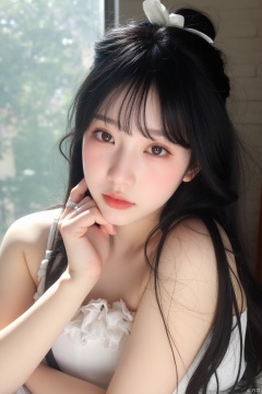1girl, solo, long hair, looking at viewer, bangs, black hair, ribbon, brown eyes, closed mouth, hair ribbon, upper body, sleeveless, indoors, lips, white ribbon, head rest, realistic