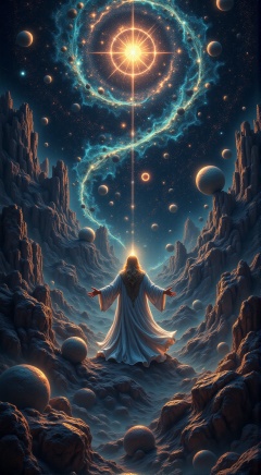 An epic scene showing the creation of the universe, with Metatron hovering above, his hands outstretched, as stars and planets appear out of nowhere. High resolution, developed textures, realistic shadows and smooth grain effect.
