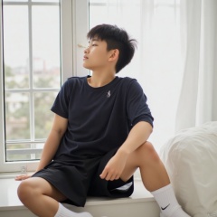 A serene and intimate shot: a young boy, hair as dark as night, sits still in a bright room. His closed eyes, a gentle curve to his face, exude peaceful contemplation. He wears simple attire - black shorts, white socks, and a deep-toned shirt that complements his dark locks. A window frames the scene, subtle watermark effect adding depth.