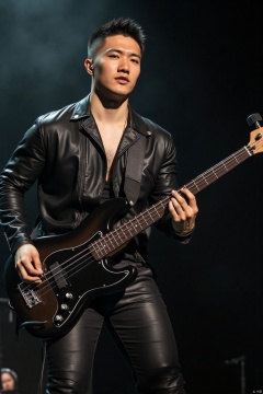 A handsome man with a very thin figure and fair skin. short hair,asian. he wore a punk-style leather jacket, an open leather vest, and a leather pants. He is a muscular man. he plays electric bass on stage. Skin texture, beautiful face, skin series, clothing details, very textured photos, his movements are chic, and his expression is exciting, Real photos, stage lighting effects, thin smoke, clear focus.,jzns,zjh