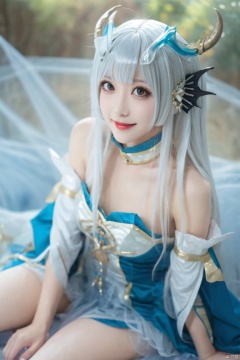 1girl, solo, long hair, looking at viewer, smile, bangs, hair ornament, dress, bare shoulders, sitting, white hair, detached sleeves, horns, cosplay, personification