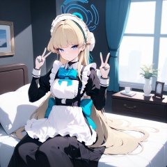 masterpiece, best quality, very aesthetic, ultra detailed,1girl, solo, <lora:tokiANILION-000016:0.8>, LMtoki, toki, long hair, halo, blonde hair, long hair, maid, long dress, black dress,long sleeves, blue eyes, puffy sleeves, maid apron, blue bowtie, blue waist bow, blue nails,looking at viewer,indoors, bedroom, sunlight, nightstand, sitting_at the window, double v,