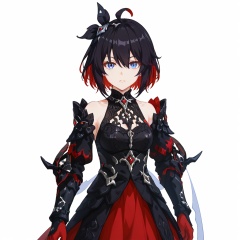 (white background:1.2),looking at viewer,(SOLO:1.4),outline,simple background,upper body, cowboy shot,looking at viewer,(((arms at side))),   seele vollerei, black hair, hair between eyes, two-tone hair, streaked hair, short hair, seele vollerei, red hair, multicolored hair, blue eyes<lora:seele-pony:0.8>