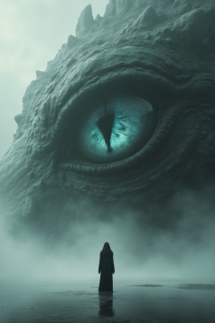 a striking and surreal scene that combines elements of both the natural world and fantasy. Dominating the composition is a massive, reptilian eye, filling almost the entire frame. The eye is highly detailed, with a slit-like pupil that suggests it belongs to a large, powerful creature, perhaps a dragon or another mythical being. The texture around the eye is rugged and scaly, giving the impression of ancient, weathered skin. In the lower portion of the image, a solitary human figure stands before the eye, dressed in a flowing black robe. The figure is tiny in comparison to the colossal eye, emphasizing the vast difference in scale and power between the two. The person stands on a surface that appears to be water or mist, which reflects the eerie, otherworldly light that surrounds the scene. The atmosphere is misty and dreamlike, adding to the sense of mystery and awe. Overall, the image is both dramatic and thought-provoking, blending cultural elements with a fantastical imagination to create a visually captivating scene.
