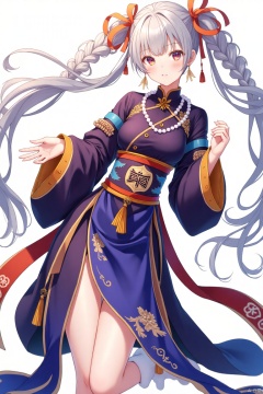 nvgege,Anime girl, elegant pose, flowing light gray pigtails, traditional Chinese inspired attire. Deep purple and royal blue layered outfit, detailed embroidery showcasing a serene, almost meditative mood. Light orange and yellow decorative elements, like scrolls, ribbons, and tassels. Subtle pearl necklace, soft light, full-body shot with a slightly elevated perspective, showcasing graceful leg lines. Character's expression is serene and calm, soft features, and large eyes. Detailed depiction of smooth skin, elaborate clothing with flowing designs, ribbons, and embellishments. Vivid color palette, contrasting deep purples, blues, and whites. Anime style. Focus on character design, fashion, and elegant aesthetic.